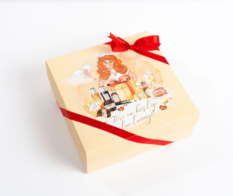 Iesaiņosim Tevis izvēlētos gardumus GLĪTĀ DĀVANU KĀRBĀ Šajā kārbā ietilpst gandrīz viss, izņemot Piparkūku mīklu izlase un lielās 750 ml sulu vai 700 ml sīrupu pudeles. Svētku kastes izmērs 190 * 190 *70 mm Jautājumu gadījumā, droši zvani, vai raksti whatsup – 28361561 Ar prieku iesaiņosim vismīļāko dāvanu pasaulē! Cenas piedāvājums spēkā iegādājoties mūsmājās “Skrīveru mājas saldējums”